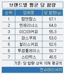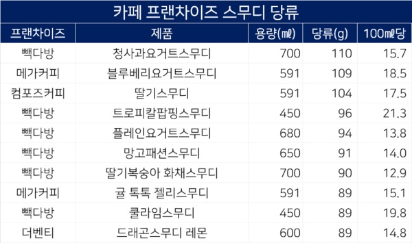 • 데이터 포커스 카페 스무디 한 잔에 당류 1일 권장치 훌쩍...평균 당 함량 80g 대형 카페 프랜차이즈에서 판매되는 대부분의 스무디 당류 함량이 성인 하루 권장량을 초과하는 것으로 나타났다. 시중 5개 카페 프랜차이즈들의 스무디 제품 43종을 조사한 결과 하루 2000kcal를 섭취하는 일반 성인 기준 1일 권장 당류 섭취기준인 50g을 초과하는 제품이 32종으로 그 비중은 무려 74.4%에 달했다. 당류 함량이 가장 많은 제품은 빽다방 '청사과요거트스무디'로 하루 권장량의 2.2배에 달하는 110g이 포함됐다. 메가커피 블루베리요거트스무디 109g, 컴포즈커피 딸기스무디 104g으로 100g을 넘겼다. 이어 △ 2025-05-19 09:00