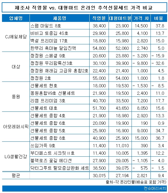 • 마켓 서베이 추석 선물세트, 제조사 직영몰보다 '대형마트 몰' 더 저렴 식품과 화장품 등 제조사들이 직영 온라인몰 강화에 나섰지만 가격 경쟁력은 여전히 뒤처지는 것으로 나타났다. 제조사 직영몰이지만 종합 온라인몰보다 가격이 싸지 않았다. 6일 CJ제일제당(CJ더마켓), 동원F&B(동원몰), 대상(정원e샵), 아모레퍼시픽(아모레퍼시픽몰), LG생활건강(LG H Shop) 등 제조사 5개사 직영몰과 대형마트 온라인몰인 SSG닷컴의 추석 선물세트 가격을 비교한 결과 직영몰의 가격이 더 비싼 것으로 나타났다. 이번 조사 대상은 직영몰과 SSG닷컴에서 공통적으로 판매하는 상품 중 업체에서 주력으로 내세운 ... 2019-09-06 08:50