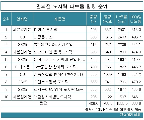 • 마켓 서베이 편의점 도시락 하루 나트륨 권장량 훌쩍...가장 짠 제품은? 간편하게 한 끼 식사를 해결할 수 있고 종류도 다양해져 편의점 도시락이 인기다. 하지만 건강에 영향을 미치는 나트륨 함량이 높아 영양성분 표시 체크 등 주의가 필요하다.컨슈머리서치가 GS25, CU, 세븐일레븐, 미니스톱 등 4개 편의점에서 판매하는 도시락 21종을 조사한 결과 1회 제공량당 평균 나트륨 함량이 1555.5mg으로 나타났다.세계보건기구(WHO)에서 지정한 1일 나트륨 권장섭취량(2000mg)의 77.8%에 육박하는 수준이다. 상위 3개 제품은 한끼 식사만으로 1일 섭취량을 초과했다.이번 조사는 면이나 잡채 등을 제외 2019-12-03 13:41