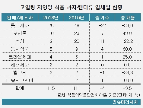 • 데이터 포커스 고열량 저영양 식품, 롯데제과 큰 폭 줄고 오리온·농심 늘고 어린이들의 안전한 식생활 관리를 위해 운영하는 '고열량 저영양 식품(고저식품)' 수가 최근 2년간 10% 가까이 줄어든 것으로 나타났다. 전체 고열량 저영양 식품의 40%를 차지하는 과자류와 초콜릿류 수가 크게 줄어든 영향이다. 반면 과채음료, 용기면류에서는 고열량 저영양식품의 수가 늘었다.컨슈머리서치가 식품의약품안전처에서 발표하는 ‘고열량‧저영양 식품(이하 고저식품)’을 분석한 결과 올해 4월 기준 우수업소와 학교 매점에서 판매할 수 없는 제품은 총 2750개다. 2018년 4월 3013개에서 2년 만에 263개가 줄며 8.7% 2020-04-20 08:45