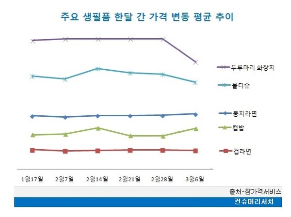 • 심층 리서치 코로나19 ‘사재기 열풍’에도 라면, 휴지 등 가격 안정...컵밥은 오름세 코로나19로 전 세계에 생필품 사재기 광풍이 불고 있지만 국내 생필품 가격은 비교적 안정세를 유지하는 것으로 나타났다.국내에 코로나19 첫 확진자가 발생한 1월20일 이전과 비교, 라면, 컵밥, 화장지, 물티슈 등의 판매 가격이 대부분 보합세를 보였다.마스크, 손 소독제가 품귀 현상을 빚으며 가격이 수 배로 치솟은 것과 달리 이들 품목은 안정적으로 생산이 유지되고 대체품이 많은 때문으로 풀이된다.한국소비자원 참가격 사이트에서 가격정보를 제공하는 라면, 휴지 등 가공식품 및 생필품 5개 품목 14개 제품의 지난 50일간 가격 변화를 2020-03-11 08:10