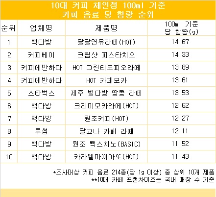 • 데이터 포커스 커피점 커피음료 당 함량 콜라와 맞먹어...빽다방 '빽스치노' 한잔에 각설탕 28개 국내 10대 프렌차이즈 커피전문점의 커피음료 한 잔당 평균 당 함량이 23.5g 수준으로 무려 각설탕 8개 분량의 당이 함유된 것으로 나타났다. 콜라 215ml 한 캔당 당함량(23g)과 맞먹는 수준이다.조사대상 중 WHO의 하루 당 권장량(50g 미만)을 상회하는 커피 제품은 빽다방(대표 백종원)의 원조 빽스치노 2종(SOFT, BASIC)을 비롯해 총 7개였다. 이들 제품은 한잔만 마셔도 WHO의 하루 당 권장량을 훌쩍 넘게 되는 셈이다.빽다방은 커피 음료 한 잔 기준뿐 아니라 100ml 기준 당 함량과 프랜차이즈별 평균 당 함 2021-03-22 09:00