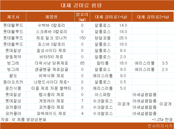 • 심층 리서치 제로슈거 음료 일부 대체 감미료 열량 높아, 성분도 깜깜이 '주의' 건강한 삶을 추구하는 웰니스 트렌드에 맞춰 식음료업계에 ‘제로슈거’ 열풍이 불고 있지만 칼로리나 당으로부터 자유롭지 않아 섭취 시 주의가 필요하다. 제로슈거라해서 다이어트 목적으로 무작정 먹었다간 칼로리 폭탄을 맞을 수도 있는 상황이다.또 일부 감미료의 경우 건강 위해성 논란이 일고 있지만 감미료의 종류와 함량을 구체적으로 표기하지 않은 깜깜이 제품도 적지 않았다. 대체 감미료로는 당 알코올인 △말티톨 △자일리톨 △에리스리톨, 고감미료인 △스테비아추출물 △수크랄로스 △아세설팜K △사카린 △아스파탐 등이 사용된다.이중 일부 감미료는 2024-10-21 09:00