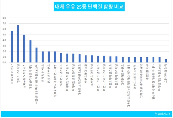 • 데이터 포커스 식물성 음료, 단백질 함량 평균 1.8g...우유 3분의 1 아몬드 등을 주원료로 한 대체 우유(식물성 음료, 비건음료)의 단백질 함량이 평균 1.8g으로 흰 우유의 32% 수준인 것으로 나타났다. 열량과 지방 함량도 일반 우유의 절반 수준이었다.아몬드, 귀리 등을 원료로 한 식물성 음료 중 멸균팩에 담겨 판매되는 25종(190ml)의 영양성분을 조사한 결과 이같이 나타났다. 서울우유 멸균 흰우유(200ml)를 비교군으로 뒀다.단백질 함량이 가장 높은 제품은 CJ제일제당의 '얼비트 오리지널'로 6.7g이었다. 이 제품은 유일하게 서울우유 멸균 흰우유(5.7g)보다 단백질 함량이 높았다.이어 2023-06-12 09:00