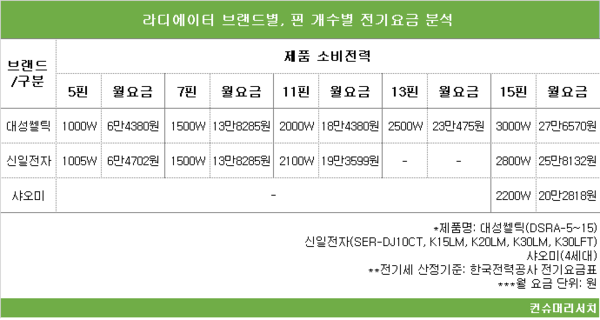 • 심층 리서치 라디에이터 전기세 폭탄 주의...전기매트보다 20배 가까이 요금 높아 최근 쌀쌀해진 날씨에 라디에이터를 가정용으로 구매하려는 소비자가 늘면서 전기세 폭탄을 맞았다는 민원도 치솟고 있다. 라디에이터는 공간 전체를 데우기 때문에 열효율이 좋지만 대부분 소비전력이 1000W(와트)를 넘어가 전기요금이 기하급수적으로 상승한다.네이버 블로그, X(전 트위터) 등 온라인 커뮤니티에는 추워진 날씨에 라디에이터를 사용했다가 전기요금 폭탄을 맞았다는 소비자 불만이 터져 나오고 있다. 하루 2~3시간 라디에이터를 켜놨는데 월 전기요금이 평소 대비 몇 배 이상 뛰거나 건물 주인으로부터 전기 요금이 많이 나와 경고조치를 2023-02-27 09:00