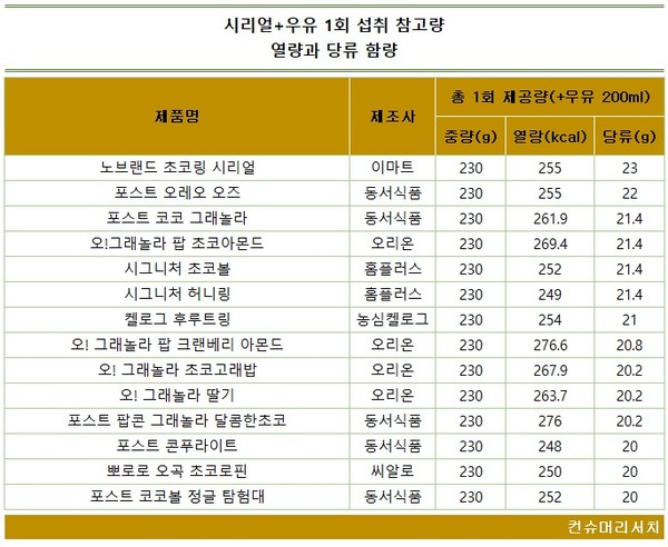 • 데이터 포커스 시리얼 당류 함량 높고 열량 낮아...영양 불균형 우려 시리얼은 식사대용으로 광고하지만 실제로는 당류 함량이 높고 열량은 낮아 영양불균형이 우려되고 있다. 열량은 평균 261kcal로 밥 한공기(315kcal)에 미치지 못하고 당류는 17.6g이 함유돼 한 끼 식사치고는 과도하게 첨가된 것으로 조사됐다.농심켈로그, 동서식품, 롯데제과, 씨알로, 이마트·홈플러스 PB 제품 등 주요 기업이 제조 판매하는 시리얼 70종을 1회 기준량에 맞춰 우유(200ml 기준)와 함께 섭취했을 때 평균 열량은 260.6kcal, 당류는 17.6g 함유로 조사됐다.시리얼은 곡물 자체를 가공한 것으로 기본적으 2022-05-24 09:00