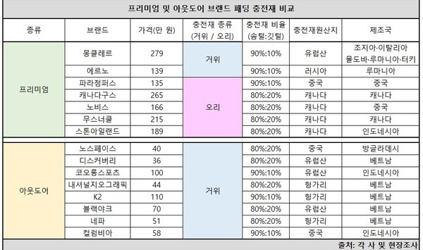 • 마켓 서베이 수백만 원 명품 패딩 충전재 값싼 덕다운...국내 아웃도어는 구스다운 수백만 원을 호가하는 해외 프리미엄 패딩 브랜드는 충전재로 오리털을 주로 사용했고, 국내 아웃도어 브랜드는 거위털을 사용하는 것으로 조사됐다. 오리털은 가격이 거위털의 절반 수준이다. 보온성을 결정하는 충전재의 솜털과 깃털 비율도 프리미엄 패딩과 일반 아웃도어 브랜드 제품의 차이가 크지 않은 것으로 확인됐다.오리털을 사용하면서도 프리미엄 브랜드 제품들은 ‘명품 패딩’으로 불리며 평균 200만 원에 이르는 비싼 가격으로 판매되고 있다. 아웃도어 브랜드 제품은 평균 가격 60만 원으로 프리미엄 브랜드 대비 3분의 1 이상 저렴하지만 보 2025-02-10 09:10