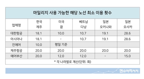 대형 항공사를 이용하는 것이 서비스나 마일리지 혜택을 가장 크게 볼 것이라 생각하기 쉽지만 실제로는 그렇지 않은 것으로 나타났다. 제주도를 많이 이용할 경우 진에어를 타는 것이 유리하고, 일본 오사카는 에어부산이 가장 유리하다. 반면 먼 거리를 자주 이용한다면 거리(마일)를 기준으로 마일리지를 적립해주는 대형 항공사가 유리하다. 국내 대형 국적사인 대한항공과 아시아나항공을 비롯해 저비용항공사(LCC)인 진에어, 제주항공, 에어부산, 이스타항공, 티웨이항공의 마일리지 규정을 조사한 결과 대한항공과 아시아나항공은 거리(마일)에 따...