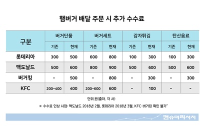 # 대전 서구 괴정동에 사는 이 모(남)씨는 롯데리아에서 햄버거를 배달한 후 영수증을 보고 의아했다. 롯데리아 홈페이지에 표시된 가격과 영수증에 적힌 가격이 달랐던 것. 홈페이지 가격대로라면 이 씨가 주문한 빅불버거세트, 불고기버거세트가 총1만2600원인데, 영수증에는 1만4200원이 찍혀 있었다. 1600원이 더 청구된 것이다. 배달원은 본사에서 정한 홈서비스 배달 가격이라 다르다고 말했다. 햄버거 업체들이 최근 햄버거 가격을 인상하면서 배달 메뉴에 부과하는 수수료도 올린 것으로 조사됐다. 또한 업체들 모두 '배달 수수료'에...