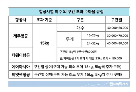 # 예약 시 알 수 없는 수하물 초과 수수료 지난 5월 에어아시아를 이용해 세부로 여행갈 계획을 세운 광주 북구에 사는 이 모(남)씨, 미리 가방을 보내려 항공사에 위탁수하물을 신청했다. 며칠 후 받은 영수증에는 추가 수하물 가격이 1kg 당 2만2000원으로 28만 원 가량이 청구됐다. 이 씨는 “에어아시아에서는 항공권 예약 전 추가 수하물 비용 관련해서는 한 마디 설명조차 없이 이런 거액을 청구했다”며 어이없어 했다. # 꼭꼭 숨은 초과 수하물 규정, 약관에 있다고? 광주 광산구에 살고 있는 천 모(여)씨는 지난 1월 마카...