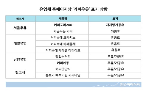 고카페인 논란을 빚은 커피우유의 식품 유형이 '커피'로 변경됐지만 제조사들 홈페이지에는 여전히 우유('가공유')로 표기중인 것으로 확인됐다. 식품의 기준 및 규격에 따라 가공유는 원유나 유가공품에 식품 또는 식품첨가물을 가한 액상의 것을 말한다. 다만 커피 고형분이 0.5% 이상인 제품은 제외한다. 우유 속에 커피 성분이 들어간 ‘커피우유’가 대부분 이에 속해 식품 유형이 ‘커피’로 분류된다. 하지만 서울우유, 매일유업, 남양유업, 빙그레 등 ‘커피 우유’를 판매하는 대부분 유업체의 홈페이지에는 이들 제품을 여전히 가공유 카테...