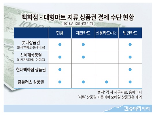 전주시 덕진구에 사는 윤 모(여)씨는 추석 명절을 맞아 백화점 상품권을 구입하려다 '현금 결제'만 가능하다는 말을 듣고 의아해졌다. 윤 씨는 "카드 결제를 아예 막아 놓는 것은 불법 아니냐"며 의문을 제기했다 백화점, 대형마트 상품권 구입 시 신용카드 결제는 안되는 걸까? 소비자들 사이에서도 "현금만 가능하다", "체크카드는 된다", "법인카드만 된다"는 등 의견이 분분하다. 소비자문제연구소 컨슈머리서치(대표 최현숙)가 확인한 결과 업체마다 운영이 다른 것으로 나타났다. 기본적으로 여신전문금융업법에 따르면 신용카드 가맹점은 신...