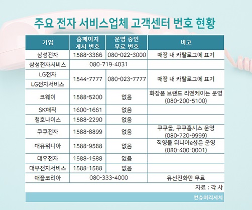 주요 가전업체 대부분이 1588 등 발신자 부담(유료) 전화를 전면에 내세워 고객센터를 운영 중인 것으로 조사됐다. 080 무료전화를 운영하고 있지만 홈페이지 전면에 번호를 노출시키지 않아 고객이 알기 어려운 경우도 있다. 소비자문제연구소 컨슈머리서치(대표 최현숙)가 국내 주요 전자·서비스 업체 12곳을 조사한 결과 080 무료전화를 운영하는 곳은 5곳으로 절반에 미치지 못하는 것으로 나타났다. 이마저도 3곳은 홈페이지에서 번호를 공개하지 않고 있다. 소비자 입장에서는 080 번호가 보이지 않는 경우 유료 전화를 이용할 수밖에...