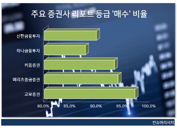 올해 하반기 상장사들의 실적 부진과 증시 폭락이 이어지고 있지만 주요 증권사에서 발간하는 리포트는 여전히 '매수(BUY)' 의견이 절대 다수를 차지하고 있는 것으로 나타났다. 실적과 상관없이 주가 하락을 오히려 저점 매수의 기회로 인식하고 매수 의견을 제시할 수 있다는 점에서 일률적으로 판단할 수 없다는 의견도 있다. 하지만 투자자 입장에서는 시장 상황과 관계없이 일관되게 매수 의견을 제시하는 리포트를 신뢰하기 어렵다는 반응이다. 소비자문제 컨슈머리서치(대표 최현숙)가 금융투자협회 자료를 분석한 결과 올해 9월 말 기준 국내 ...