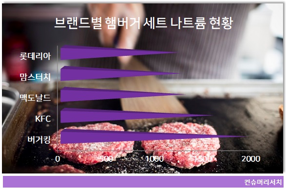 유명 햄버거 프랜차이즈인 버거킹의 세트 제품에 들어 있는 나트륨량이 평균 1926mg에 달해 하루 권장 나트륨 섭취량 2000mg에 육박하는 것으로 나타났다. 또 국내 햄버거시장 5대 브랜드의 세트 제품 1개만 먹어도 나트륨 하루 권장량의 절반 이상을 섭취하게 되는 것으로 조사됐다. 소비자문제연구소 컨슈머리서치(대표 최현숙)가 버거킹, 맥도날드, KFC, 롯데리아, 맘스터치 등 5대 햄버거 브랜드에서 판매 중인 햄버거 세트 50개 제품의 나트륨 함량을 조사한 결과 4개 제품이 세계보건기구(WHO) 하루 권장 섭취량 2000mg...