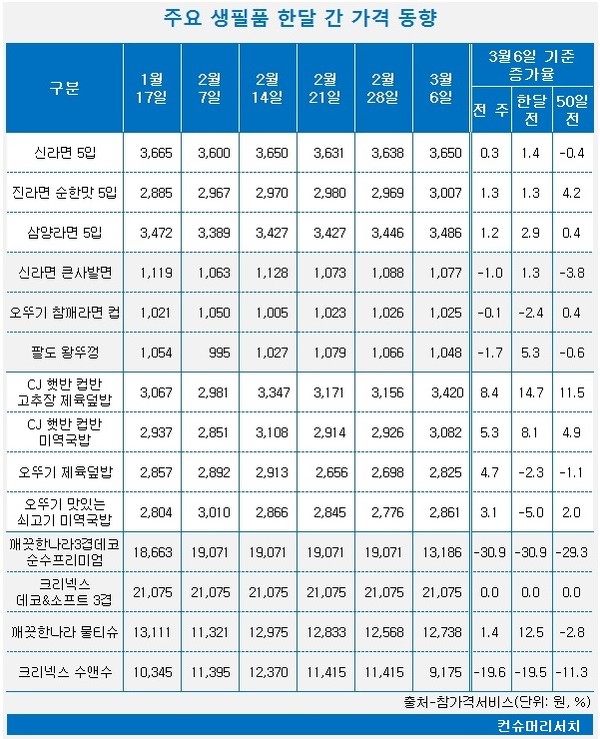 한국소비자원 참가격 사이트에서 가격정보를 제공하는 라면, 휴지 등 가공식품 및 생필품 5개 품목 14개 제품의 지난 50일간 가격 변화를 조사한 결과 라면류, 컵밥은 보합세를 기록했고 화장지와 물티슈는 오히려 가격이 내렸다.