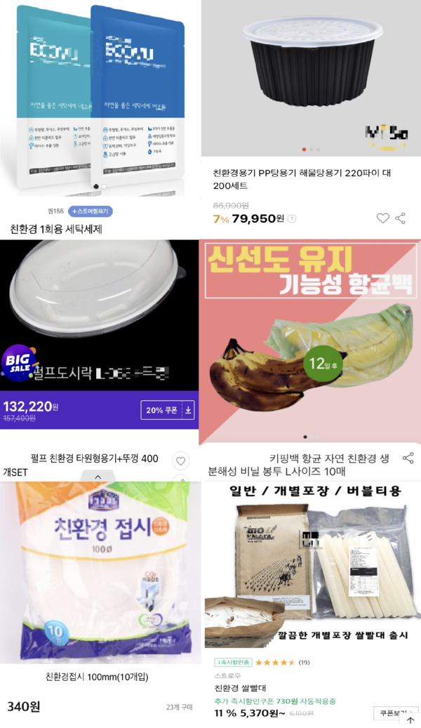 G마켓에서 판매되는 한 친환경 접시도 별도 자료 없이 상품 이름에 친환경이라는 단어가 포함돼 있었다. 위메프에서 판매되는 종이 호일은 재질에 대한 설명 이외엔 친환경성에 대한 특별한 근거를 명시하지 않았다. 쿠팡에서 판매되는 한 친환경 용기의 경우도 친환경성에 대한 별다른 자료가 없었다. 롯데온에서 파는 용기 세트도 특별한 근거 자료 없이 친환경성을 홍보하고 있었다.