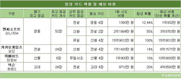 확률만 놓고 보면 리니지가 비교적 비용이 들어가는 것처럼 보인다. 하지만 실제로 이 게임들은 뽑기에서 획득한 최고 등급 카드 4장을 추가로 모아 ‘합성’을 통해 확률적으로 상위 등급의 카드를 뽑아야 한다.