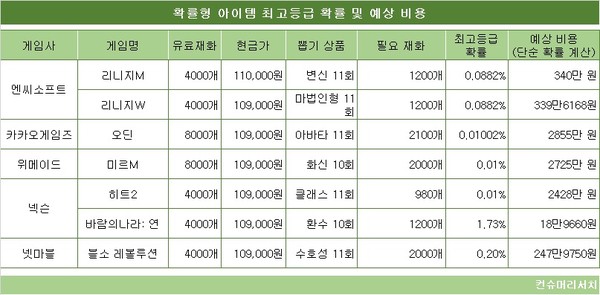 카카오게임즈 오딘은 0.01002% 확률로 최고 등급 한 장을 뽑으려면 2855만 원, 6월 말 출시된 위메이드의 미르M은 0.01%로 최고 등급 한 장에 최소 2725만 원을 들여야 한다. 가장 최근 출시한 넥슨 히트2의 경우 최고 등급을 뽑을 확률이 0.01%로 한 장에 2428만 원이 들어간다.