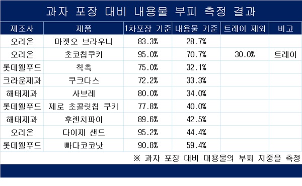 포장공간비율이 가장 높은 제품은 오리온의 '마켓오 브라우니'로 개별포장을 모두 제거하면 상자 대비 과자 부피는 28.7%에 불과했다. 마켓오 브라우니 과자는 360㎤로 종이 상자(1254㎤)의 30%도 채우지 못했다. 오리온의 초코칩쿠키는 개별 포장 내부에 플라스틱 트레이까지 모두 걷어내면 과자가 최종포장에서 차지하는 비율이 30%에 불과했다.