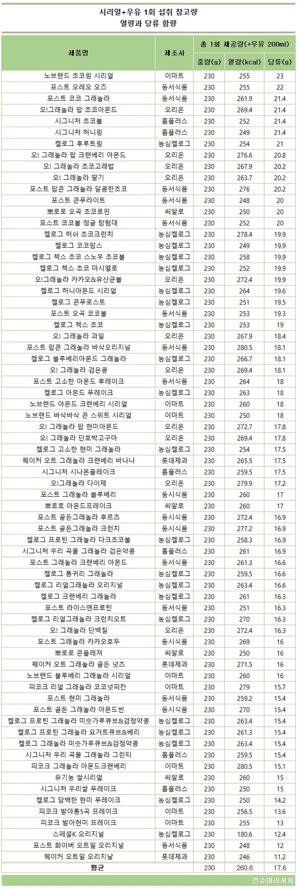 농심켈로그, 동서식품, 롯데제과, 씨알로, 이마트·홈플러스 PB 제품 등 주요 기업이 제조 판매하는 시리얼 70종을 1회 기준량에 맞춰 우유(200ml 기준)와 함께 섭취했을 때 평균 열량은 260.6kcal, 당류는 17.6g 함유로 조사됐다.