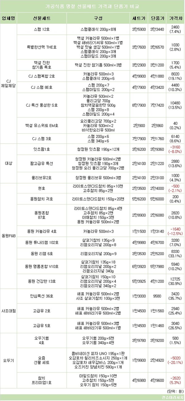 CJ제일제당 'CJ 특선 풍성한 S호'도 가격차가 1만 원 넘게 벌어져 단품을 사는 게 더 나았다. 카놀라유 500ml 2개와 올리고당 700g, 참치액깔끔한맛 500g, 스팸 200g 8개, 스팸마일드 200g 4개로 구성된 이 제품은 8만7900원에 판매되고 있는데 단품으로만 사면 7만7420원에 구매 가능했다.